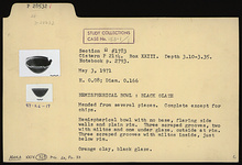| Description: | Mended from several pieces; complete except for chips. Hemispherical bowl with no base; flaring side walls; plain rim. Three scraped grooves, two with miltos and one under glaze, outside at rim. Three scraped grooves with miltos inside, just below rim. Orange clay. Black glaze. | |