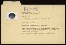 Description:   Plate with ribbon handles. Mended from several pieces. Complete. Plain plate with disk foot. Strap handles pinched close and set vertically (in section) to rim. Dip glazed at handles with one dribble.