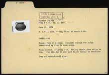 | Description: | Mended from 24 pieces. Complete except for chips. Discolored by fire in some areas. Round bottom, flaring rim. Rising handle from belly to rim. Iron residue in one spot below handle on exterior. Gray to reddish-buff clay. | |