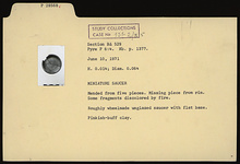 | Description: | Mended from five pieces. Missing piece from rim. Some fragments discolored by fire. Roughly wheelmade unglazed saucer with flat base. Pinkish-buff clay. | |