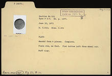 | Description: | Mended from four pieces. Complete. Plain rim, no foot. Flat bottom left from wheel cut. Buff clay. | |