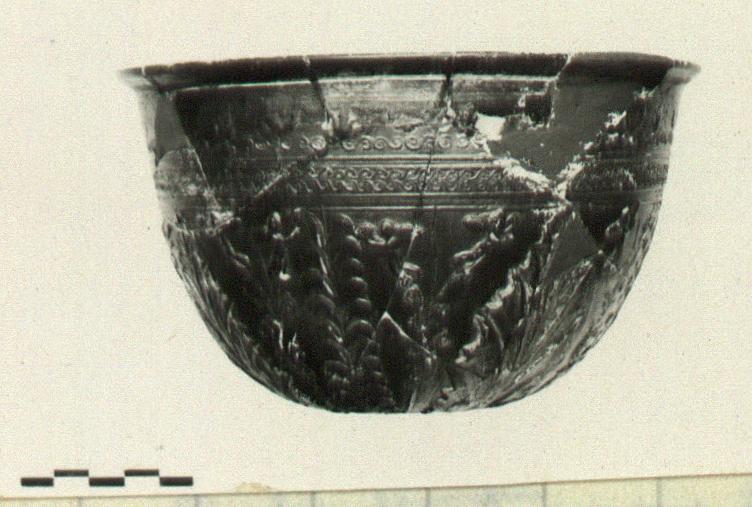 | Description: | Mended and restored in plaster; complete except for chips. Medallion: double rosette surrounded by a row of pointed leaves; springing from the medallion are large acanthus leaves alternating with tall fronds; between these are tendrils; Erotes in field. Rim pattern: simplified guilloche pattern surmounted by a row of double spirals topped by alternating birds and rosettes. Scraped groove with miltos around medallion and below rim. Good black glaze. | |