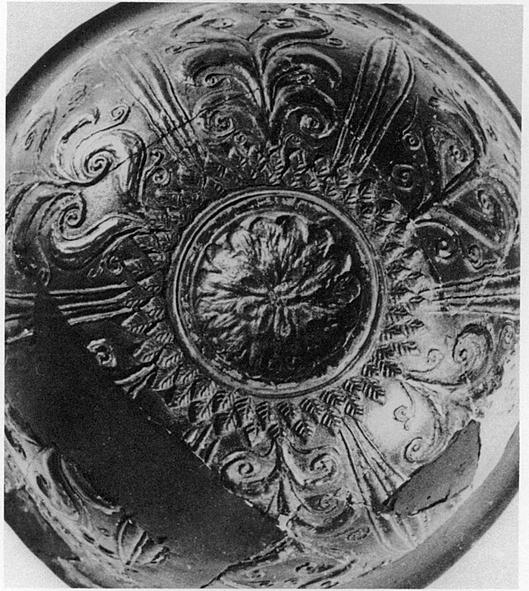 Description:   Over half preserved; mended and restored in plaster. Medallion: large many-petalled rosette, from which spring two rows of small pointed leaves; from them spring pointed lotus leaves alternating with a plant with thick tendrils.