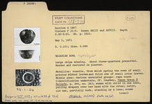 | Description: | Large chips missing; about three-quarters preserved; mended and restored in plaster. Medallion: rosette, from which spring two rows of small pointed ribbed leaves and a third row of small lotus leaves. Middle zone: various unrelated groups; rape scene (identification uncertain, cf. Courby (1922), Vases Grecs a Reliefs, p. 344, no. 26); woman with child in one hand, pulling drapery over her head with the other; Satyr; old man, partially nude, standing by a tree; woman lifting a child over her head; each group appears two times. Rim pattern: simplified guilloche surmounted by alternating palmettes and dolphins. Scraped groove around rosette and below rim (cf. P 24082). Black to reddish-green glaze. | |