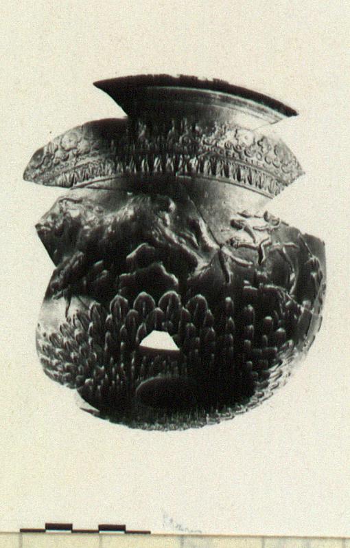 | Description: | Mended from many pieces; about two-thirds missing; full profile preserved. Medallion: double rosette, surrounded by scraped groove with miltos, from which spring nine rows of small rounded leaves (lotus?). Middle zone: large boar running left, being pursued by a mounted spearman in much smaller scale; spearman attacking indistinct animal (lion?); in field, various dogs and hares. Rim pattern: tongue pattern, two rows of circles, double spirals surmounted by alternating rosettes and palmettes. Orange clay. Metallic black glaze. Cf. P 19720. | |