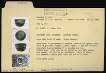 | Description: | Less than half of bowl preserved; chips missing. Restored in plaster. Medallion: eight-petalled rosette, from which spring four rows of pointed, ribbed leaves, with a fifth row of some elaborate bud springing from opening leaves. Middle zone: wild boar being hunted by men with swords and spears, as well as on horseback; dogs in field. Rim pattern: simple guilloche and row of circles. Good black glaze. | |