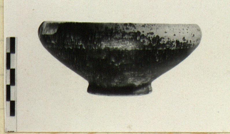 | Description: | Mended from two pieces; complete except for chips. Ring foot with central nipple; straight flaring side walls with incurved rim. Light orange clay. Peeling red to green to brown glaze. | |