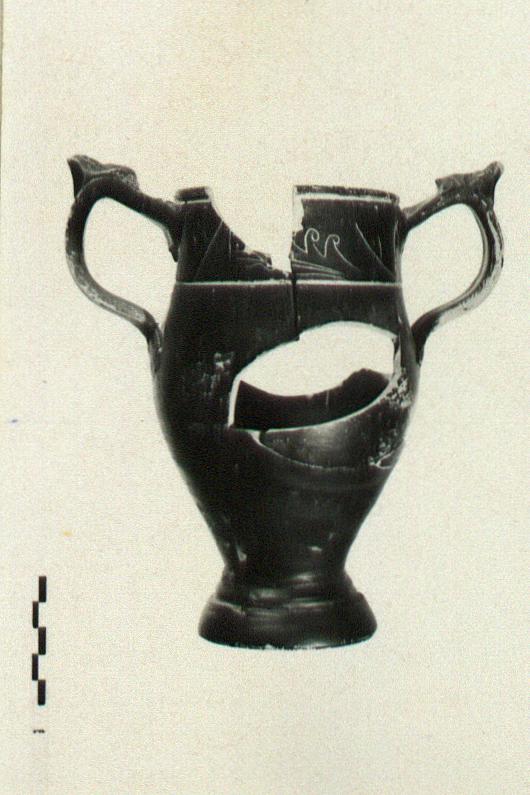 | Description: | Mended from several pieces; several large chips missing. Large flaring moulded ring foot; elongated body with largest diameter about halfway up; vertical strap handles from belly to below rim with applied masks; vertical rim set off by scraped grooves. Decoration between grooves: wave pattern in incised lines. Buff clay. Brownish-black glaze. | |