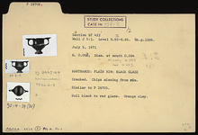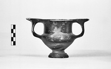 | Description: | Cracked. Chips missing from rim. Similar to P 28705. Dull black to red glaze. Orange clay. ADDENDA P 28705: Moulded foot with scraped groove with miltos at junction of mouldings. Groove under glaze on resting surface with narrow scraped band inside concave undersurface. Plain rim. Long thin spurs on handles. | |