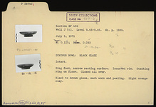| Description: | Intact. Ring foot, narrow resting surface. Incurved rim. Stacking ring on floor. Glazed all over. Black to brown glaze, much worn and peeling. Light orange clay. | |