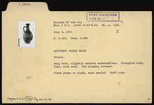 | Description: | Intact. Ring foot, slightly concave undersurface. Elongated body. Tall, thin neck. Rim sloping outwartd. Fired brown to black, much peeled. Buff clay. Originally idendified as lekythos. | |