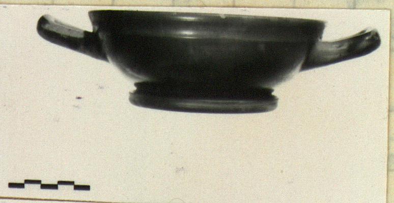 Description:   Complete except for small chip; mended from two pieces. Thick ring foot, slightly moulded at top; low bowl with concave lip, offset inside and out; two horizontal handles, attached just below lip and rising almost to level of rim.