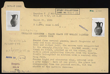 | Description: | Mended from several pieces; small fragments of body and base missing. Thin and rather tall, the narrow neck exaggerated by the sharply flaring lip. Trefoil mouth, very broad in front, pinched up at the sides and with a point projecting inwards from the handle. Handle triangular in section with a central rib. Ring foot. An ivy wreath painted around the neck. Coarse light red micaceous clay, covered with a gray slip. Save at one point, the glaze has disappeared from the painted wreath but the shadow of the pattern remains. | |