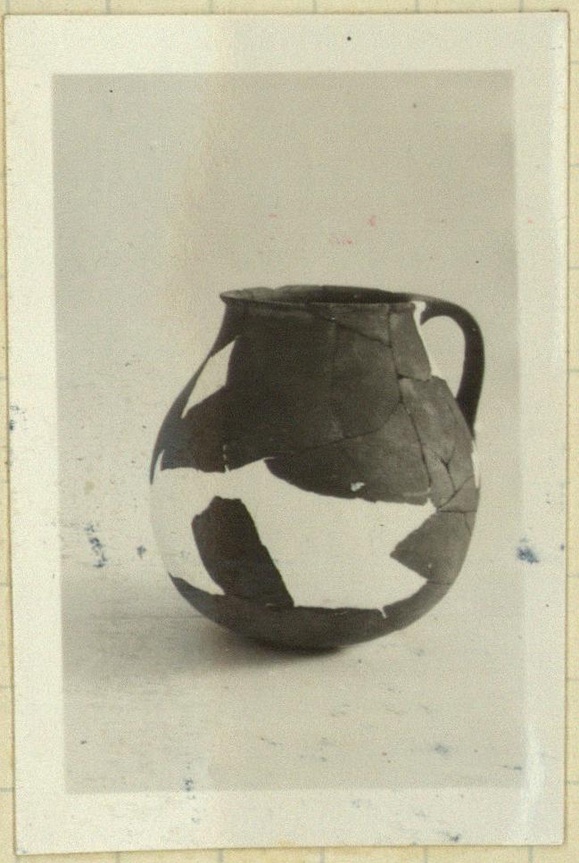 | Description: | Fragment of lip and many from the body missing; restored in plaster. Large round mouth; broad vertical handle; no neck; nearly round bottom, blackened from fire. Rather coarse brick red clay. Cf. Agora XII, no. 1932. Cf. Agora XXXIII, no. 60. | |