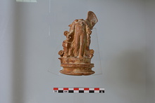 | Description: | Missing are head of plastic figure, tips of wings, left forearm of figure and assorted minor chips. Elaborately moulded base pierced by small hole at center of underside and at top of base in front of figure. Lekythos decorated with large palmette over band of dots. Figure is winged female (Nike or Eros?) whose lower legs are partly covered by diaphanous drapery which hangs from shoulders and billows to feet behind. Right hand holds closed vessel (oinochoe?) which rests on altar at proper right. Left arm is crooked and hand is placed over left breast (-or hand of little baby Eros?? S.R.). Traces of blue and red paint on white slip. Orange-beige clay. Cf. Trumpf-Lyritzaki (1969), Griechische figurevasen, pl. 5, no. FV 33. | |