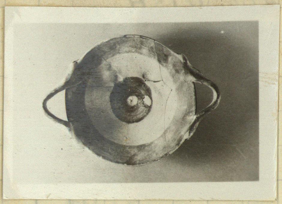 | Description: | Ribbon-handled plate. Mended from three fragments; complete. Two horizontal band handles, roughly attached. Small flat bottom. Buff clay; red glaze on handles and on interior, with a broad reserved band and a central reserved dot. Exterior unglazed, save where the glaze has run over in places from the interior. | |