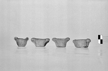 | Description: | Complete. Wheelmade. Rim nearly vertical, two vertical attached handles. Orange to pink clay. | |