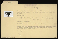 | Description: | Mended from several pieces, restored in plaster. Moulded foot with reserved groove at junction of mouldings. Groove in resting surface. Moulded rim. Long thin spurs on handles. Dull black glaze, partly peeled. Red clay. | |