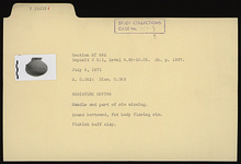 | Description: | Handle and part of rim missing. Round-bottomed, fat body flaring rim. Pinkish-buff clay. | |