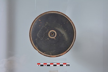 Dull black glaze. Orange clay.