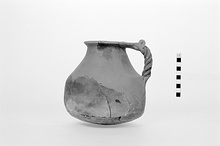 | Description: | Restored in plaster. Rounded bottom; convex wall; tapering concave neck; out-turned rim flanged to receive lid; twisted handle, bolster at top. Gritty brown-red clay, blackened by fire. Unglazed. | |