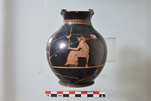| Description: | Mended. Chips missing. Low flaring foot, reserved underside. Bulging body. Trefoil mouth. Scene surrounded by reserved line on three sides and painted ovolo on top. Depicted is seated woman on stool to left dressed in chiton and himation. She balances a long stick on her right hand. Black glaze. Red clay. | |