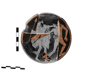| Description: | a) Chips missing from rim. Depicted is Hermes in chlamys with winged feet and cadeusis to right with left arm resting on shoulder of youth holding cock, also to right. Head of youth turned back to Hermes and right hand clasping Hermes' wrist. b) Fragment of opposite side of a) preserved. Depicted is nude male with long hair, seen frontally. c) Fragment of lower left side of same side as b). Preserved is a piece of flying drapery and a right hand held at body. Also a vertical, possibly a staff; underside preserved. Black glaze, red figure. Orange clay. Addenda July 2024: d) added from Lot ΒΓ 360. Joins with fragment b) near bottom edge, but not mended. Preserves the foot and ankle of the right figure, shin left figure, and a curved object. Underside reserved but finely finished. e) added from Lot ΒΓ 358. Edge of the disk but does not join c). On black-glaze field: top of the striped scepter with finial. Underside reserved with a light groove near edge; otherwise finely finished. Side A [missing since 1974]: Hermes and Ganymede; Side B: probably Zeus and Ganymede. The curved object may be a hoop. ADDENDA Penthesilea Painter (JRG). | |