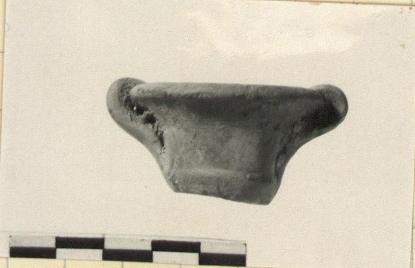 | Description: | Intact. Flat under surface, sharply flaring rim. Two vertical strap handles attached on rim and near base. Unglazed. Orange buff clay. | |