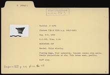 | Description: | Mended. Chips missing. Flaring base, flat underside. Concave-convex side walls. Handle projections at rim. Thin brown wash, peeling. Buff clay. | |