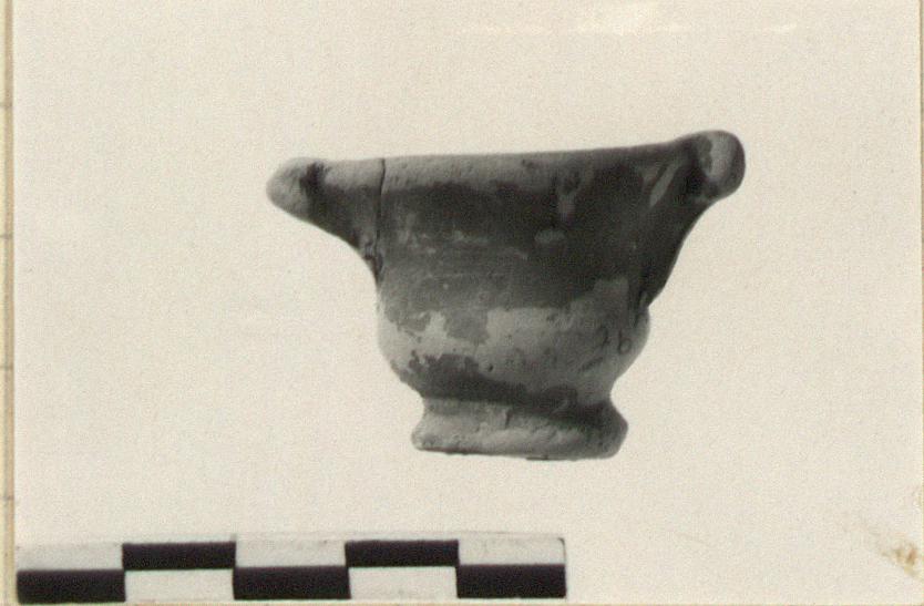 | Description: | Mended. Chips missing. Flaring base, flat underside. Concave-convex side walls. Handle projections at rim. Thin brown wash, peeling. Buff clay. | |