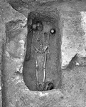 Description:   Complete except for chips. Coarseware pot. Rounded bottom, round body, high wide convex neck. Broad vertical handle.