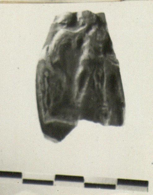 | Description: | A bit of the wall preserved with two figures of Dionysos group. Glaze red to brown, peeled almost entirely off the inside, and off the top of the outside. | |