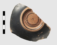 | Description: | Single fragment, broken all around. Ring foot. Resting surface and underside reserved with three circles. Outside of foot reserved. On bottom, graffito. Black glaze. Attic clay. Cf. Agora XII, no. 462 (ca. 425 B.C.). | |