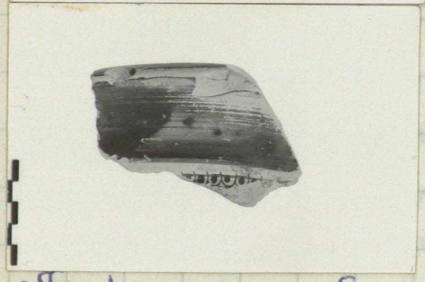 | Description: | Joins P 30005e. Two non-joining rim fragments. Flaring rim with flat top sloping outward. Offset from body. Below offset, a row of ovoles. Reserved bands inside, at rim and below rim. a) Preserves part of scene: woman with frontal torso turns head to left. She wears a sakkos, and her right arm is partly raised. At left, another figure of whom only one hand, open in a gesture toward the woman, is preserved. Black glaze inside, mottled, brownish outside and peeling. Orange clay. ADDENDA Perhaps P 31542 part of same vase. | |