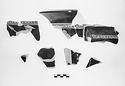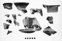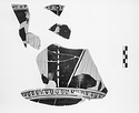 | Description: | 15 Fragments of rim and body, including one lug handle. a) Two joining body fragments depict head of Kastor with petasos to the right and the top of two spears. An inscription in added red to the right names him. b) Single body fragment has arm and hand of Polydeukes with trace of his lower torso. He is named in a retrograde inscription in added red. c) Four joining fragments preserve part of rim, body and one lug handle. Head of horse to right. d) Three joining body fragments give part of face, right arm and upper toso of bearded male figure standing frontally, looking left, wearing mantle and wreath. e) Single fragment of rim and upper body. f) Single body fragment with part of upper border. g) Seven joining fragments from the lower body. On the left, shanks and mantle of a figure probably holding striped scepter. To the right, lower part of mantled youth leaning left on staff. h) Two joining fragments of lower border. i) Single fragment from top of body, showing top of a striped scepter which overlaps the egg pattern of the border. j) Single body fragment depicts someone holding a striped scepter. k) Single body fragment showing part of striped scepter. l) Two joining body fragments give part of the shanks and mantle of a figure together with part of a striped scepter which the figure probably held. m) Two joining fragments from the body give part of the lower egg pattern border. n) Single body fragment with part of upper border and reserved area around handle. o) Single rim fragment with reserved band. A) Probably the setting out, or return, or apotheosis of the Dioscuri. B) Youths and men. ADDENDA Section nos. that belong to this pot: ΒΓ' 182, ΒΓ' 183d, ΒΓ' 514. | |