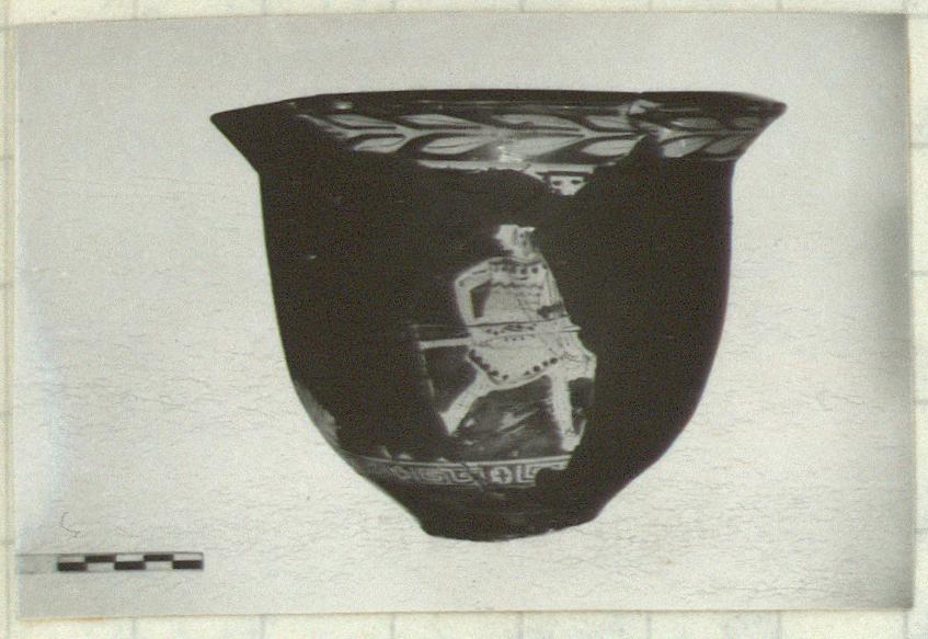 | Description: | Mended from many pieces. Foot missing. About half of walls missing. Nearly all of rim preserved. Flaring offset rim with top sloping outward, reserved bands at rim and below rim inside. Rim has laurel wreath. Below it a reserved band. A) Mounted Amazon rides left toward hoplite. Amazon armed with spear. She wears a spotted cap, a skirt and striped trousers. The hoplite, who stands with left foot upon a rock, wears greaves, cuirasse, and Attic helmet and is armed with spear and shield. Elaborate spiral pattern on cuirasse done in relief line visible inside of shield. B) At right, a figure striding to right, looking back to left. An Amazon, she wears a skirt, jacket and trousers and cap, and carries spear in her right hand, a lunate wicker shield in her left hand. To left are traces of the feet of a trousered figure walking to right. Possibly a scene of Amazons setting out. Ground line is maeander and saltire squares. Black glaze inside and out. Orange clay. | |
