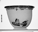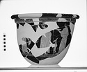 Flaring rim with round projecting lip. Below lip are band of ovoles and dots on offset surface. Reserved band inside, below rim. Trace of loop handle.