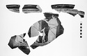 e) Four joining rim fragments on which is preserved part of the head of Leto and a leaf from Apollo's branch.