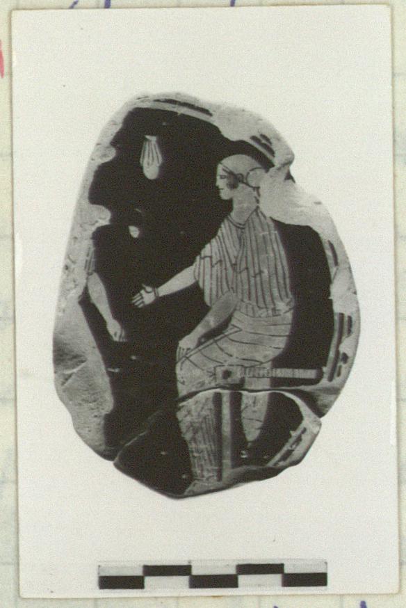| Description: | Walls, foot and half of floor of cup missing. Tondo surrounded by two reserved bands. At right a woman sits on a stool. She wears a chiton and has her himation wrapped around her lower body. Her left hand rests on her lap, her right is extended. Feet close together, her hair is bound up in a sakkos. She wears a bracelet on her right wrist. To the left another female figure, probably standing. A sack of some sort hangs on the wall. Greenish-black glaze. Red clay. | |