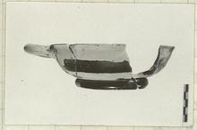| Description: | Ring foot with reserved underside and resting surface. Slightly projecting rim, flat on top, sloping inward. Loop handle. Beige clay. Cf. Agora XII, no. 754, 420-400 B.C. | |
