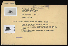 | Description: | From a pot wall, unglazed inside. Preserved is the forequarters of a horse below the withers, and the lower leg of a rider. Details incised; added red on the chest of the horse. | |