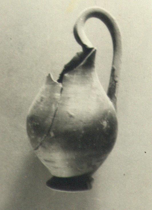 | Description: | Most of the neck and trefoil lip missing. The handle, high-swung above the lip, seems never to have been glazed; elsewhere black glaze partly fired red, much worn. | |