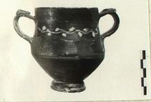 | Description: | Mended and restored. Parts of rim, handle and body missing. Base has profile of two half-rounds separated by a concave area. Sides slope out sharply to point of greatest diameter; just below this point, a horizontal groove around body. Above, sides are slightly concave ending in simple rim. Two vertical handles with applique leaf(?) on top. Between handles a design of two rows of interconnected ivy leaves in diluted clay. A single vertical white line marks edge of decoration. Black glaze much worn on one side and part of one handle. Dull buff fabric. | |