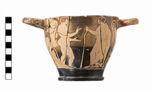 | Description: | Large chips missing. Mended and restored in plaster. Torus ring foot, out-turned rim, triangular handles. A) Nude youth at left approaching a standing draped male who holds a staff in his right hand. B) Two standing draped figures facing one another, one holding a staff. Each scene framed by high tendrils; a large palmette under each handle. Reserved: resting surface, underside with two glazed circles. Upper half badly misfired. Pink clay. Cf. Agora XII, no. 349. | |