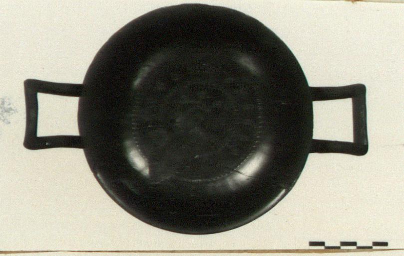 | Description: | Mended. Both handles, much of rim restored in plaster. Moulded ring foot, ribbed body (incised), out-turned lip. Reserved: underside with two glazed bands, two circles and dot. Scraped groove at juncture of foot and wall. Decoration within: row of ovules around 18 linked palmettes, around a row of ovules, around 8 linked palmettes around a row of ovules, around four ovules set to form a rosette. Good black glaze. Buff clay. Cf. Agora XII, no. 493. | |
