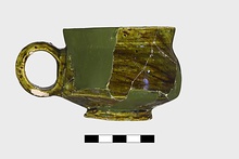 | Description: | Handle, bottom and complete profile on one side preserved; restored in plaster. Low flat base; lip slightly flaring; ring handle set vertically on side. Chalky biscuit covered with crackly green glaze. | |
