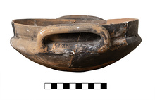 | Description: | Mended and heavily restored; much of body, rim, flange missing. Lower part of body rounded with no defined base; curves in sharply at shoulder to tall slightly flaring rim which has flange on interior; two horizontal rolled handles. Section of lopas where one would expect to find spout is now missing. No glaze. Household orange to gray fabric. Cf. P 30640 for fabric. | |