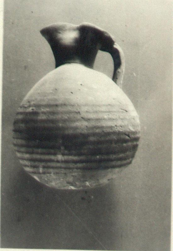 | Description: | Pear-shaped body; no foot, but a flat bottom. Small vertical handle. Trefoil mouth. Coarse red clay fired black on lower body. Traces of blackish paint (over a buff slip?) on handle and on body below handle. Local ware. | |