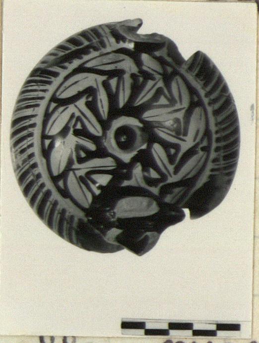 | Description: | Chips and handle missing, also end of mouth. Ring foot, reserved underside and resting surface, lower wall black glazed. Upper wall divided into two tiers, the upper reflecting the area of a smaller bowl which held the actual liquid, i.e. something of a false vessel. Lower tier reserved, with alternating bands and lines of glaze. Upper band leaves done in red figure. Bands divided by a scraped groove. Glazed knob at top. Knobs protrude from either side of neck of spout. Similar, though not so elaborate, to P 30928. Attic clay. | |