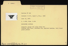 Description:   Complete except for chips from rim. Flaring disk foot, inturned rim, applied handles.
